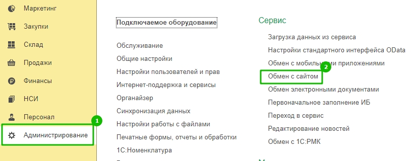 - В настройках сайта, создайте логин и пароль, которые будут использоваться при обмене с 1С